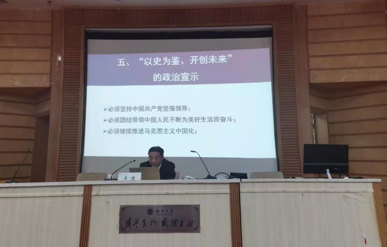 李捷教授以习近平总书记“七一”重要讲话内容为蓝本,站在中国共产党走过的百年历程的视角上,回顾了党在四个时期所作出的历史贡献,讲述了中国共产党为不断推进中华民族伟大复兴这个主题而开展的历史任务,总结了历史性成就,分析了中国共产党百年大党形象塑造过程,讲解了党“以史为鉴,开创未来”的政治宣示,且通过古今中外的横纵对比,进一步阐述了当今世界的发展趋势。李捷教授着重对实现中华民族伟大复兴的主题是如何产生与展开的问题进行讲解。他指出中华民族伟大复兴的主题源于中华民族几千年的文明史;源自鸦片战争后国家蒙辱、人民蒙难、文明蒙尘遭受的前所未有的民族劫难;源自无数仁人志士的英勇抗争与不懈求索。而实现中华民族伟大复兴的主题的展开可以分为四个时期,即第一个时期:创造了新民主主义革命的伟大成就;第二个时期:创造了社会主义革命和建设的伟大成就;第三个时期:创造了改革开放和社会主义现代化建设的伟大成就;第四个时期:创造了新时代中国特色社会主义的伟大成就。