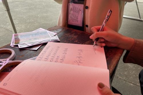 在本次军训展中,首先映入眼帘的是展板上由同学们军训期间的照片拼凑而成的数字“2021”,每一张照片都是一段回忆——与教官的第一次见面,第一次站军姿,为同学庆祝生日,分列式的刻苦训练……同学们纷纷驻足欣赏,合影留恋。欣赏照片墙后,同学们可以在展览桌前挑选并带走自己心仪的照片,将这段定格的美好回忆收藏起来。14天的军训,大家心中多有感悟,宣传部也贴心地为大家准备了留言簿,将无限的感想与感动转化为笔下的文字。例如中国共产党历史班黄志鸿在留言簿上写道:“感谢汗水,感谢你们”。简单的文字背后是深切的感情。思想政治班邓小凡满含深情地写下“祝愿马院越来越好,祝愿我们天天开心,也祝愿未来的我们更加欢快。凡是往后,皆为幸福,前程似锦”。最后,同学们可以获得一个篆刻有自己名字的军训纪念木制书签,以期在往后的学习生活中,也能不时想起这段美好的回忆。