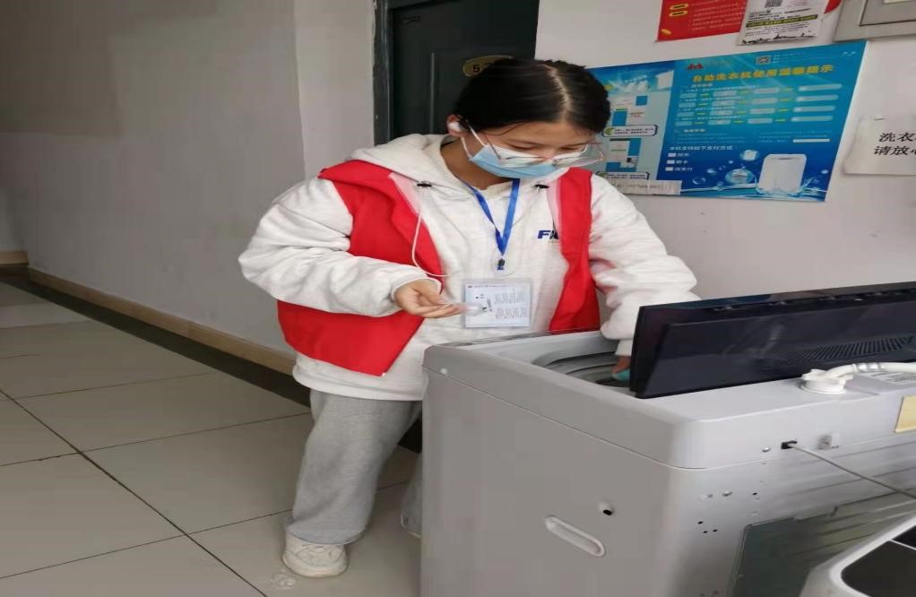针对使用对象广泛的宿舍楼栋共享洗衣机,志愿者们严格按照清洁要求和说明,用专用清洁剂清洗洗衣机,对洗衣机内壁和过滤网进行清洗消毒。在等待的同时,党员代表和志愿者们在宿舍楼栋门口给来往的同学们送去清洁剂和泡腾片,为他们讲解使用方法和注意事项并提醒他们定期清洁、注意洗衣机卫生。