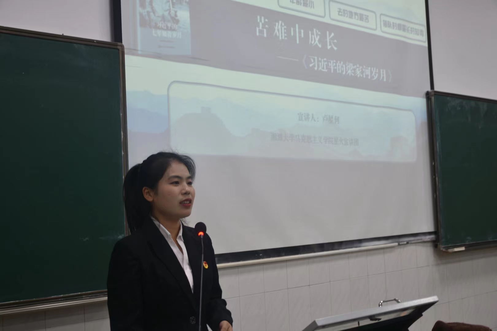 其次,通过星火宣讲团成员卢星何讲述习近平同志在梁家河的成长故事,同学们学习到应勇敢面对生活和学习道路上的艰难困苦,坚强地寻找和实现人生的意义、“上下求索”的精神;星火宣讲团成员张君鸿同学讲述的习近平总书记与宁德反腐的故事,让同学们从中国共产党不断进行自我革命的征途中感受永恒不变的初心;通过星火宣讲团成员曹瑞结合自身社会实践经历讲述习近平总书记情系江河的故事,同学们学习到水资源生态保护、碧水保卫战等国家重大发展战略。