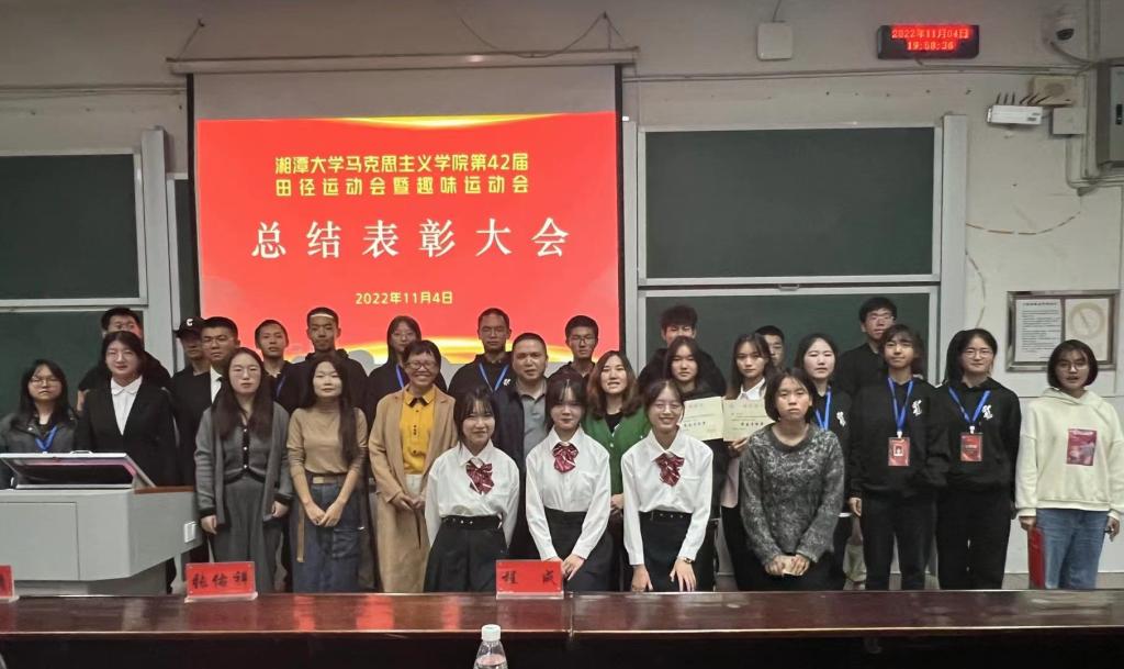 湘潭大学日韩欧美中文第四十二届学生田径运动会暨趣味运动会总结表彰大会于2022年11月4日晚19:30在经管楼第四阶梯教室圆满召开。在本届校运会上,我院荣获女子团体第三名、男子团体第七名、混合团体第七名、体育道德风尚奖共四项荣誉,包揽全部奖项,取得我院历史最佳成绩。为总结经验,表彰先进,我院特召开本次大会。