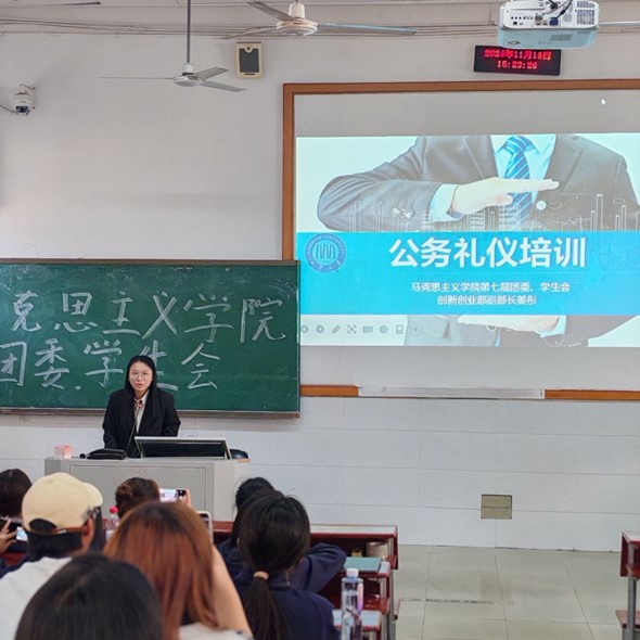 (图为创新创业部副部长姜彤进行公务礼仪培训)