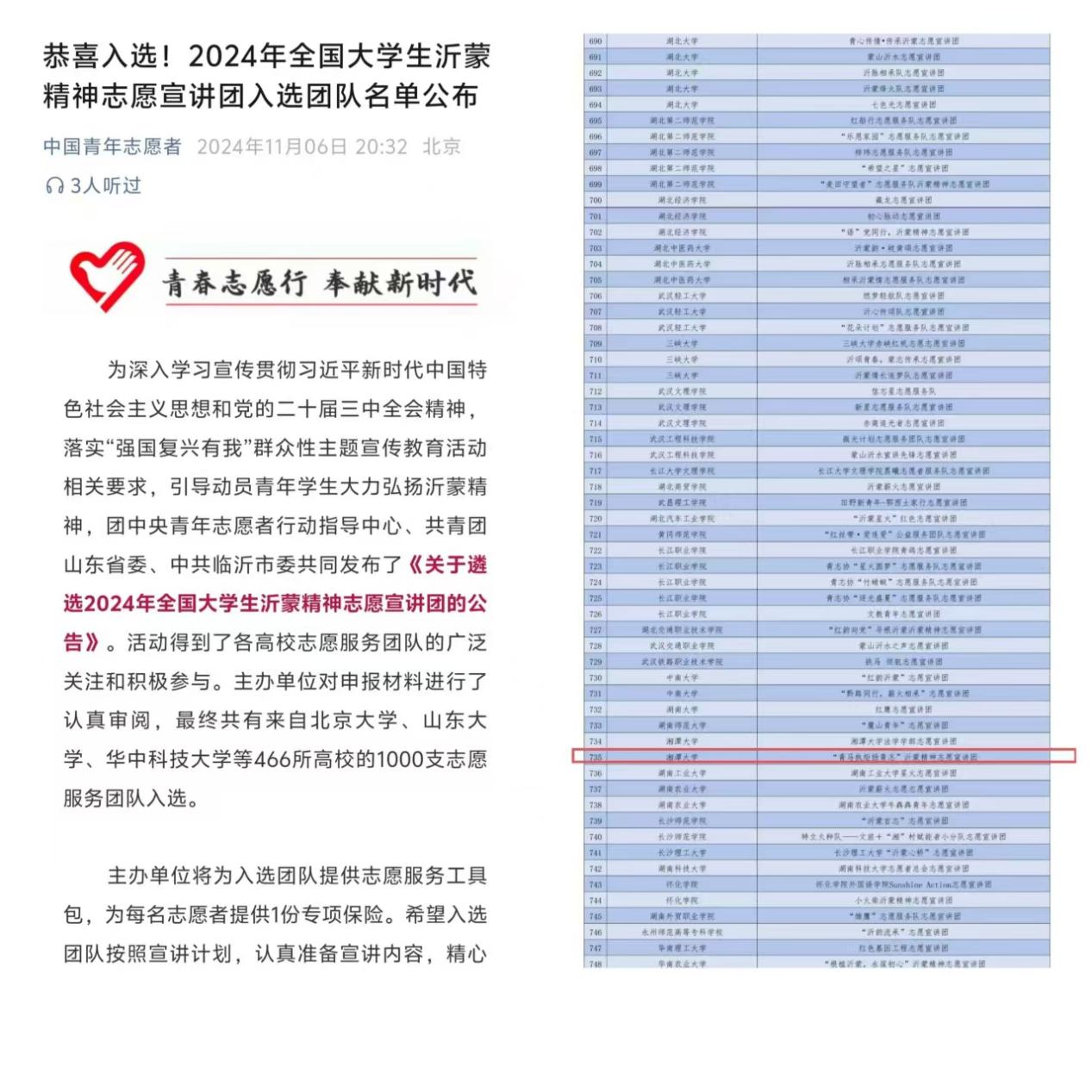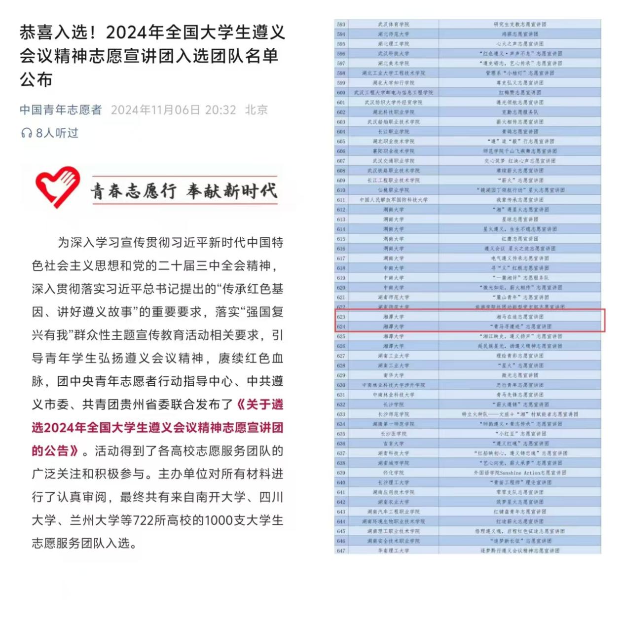 为贯彻落实党的二十届三中全会以来党中央关于“强国复兴有我”群众性主题宣传教育活动的相关要求,引导动员青年学生大力弘扬遵义会议精神和沂蒙精神,在中国青年志愿者协会发布《关于遴选2024年全国大学生遵义会议精神志愿宣讲团的公告》《关于遴选2024年全国大学生沂蒙精神志愿宣讲团的公告》后,湘潭大学日韩欧美中文积极动员并组织同学进行申报。