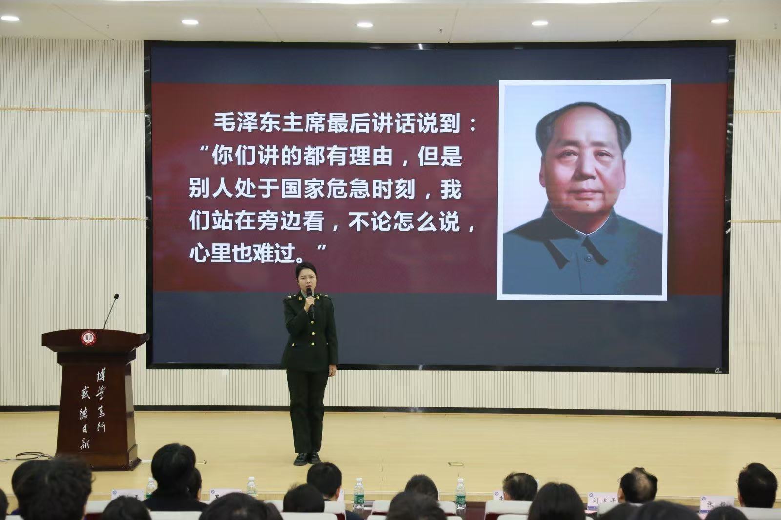刘建平教授以其父亲的亲身经历讲述抗美援朝的伟大意义,希望同学们能坚守初心使命、勇于担当作为、积极投身实践,进一步培育忠诚的政治品格、筑牢坚定的思想根基、锤炼无我的责任担当,坚定理想信念、用奋斗擦亮底色,为实现中华民族伟大复兴的中国梦贡献力量。