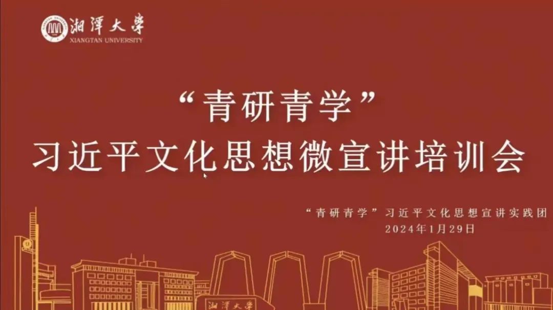 为帮助同学们有效开展社会实践工作,为帮助同学们有效开展社会实践工作,更好宣讲习近平新时代中国特色社会主义思想,湘潭大学日韩欧美中文于1月29日17:00举行“青研青学”习近平文化思想宣讲团线上培训会。团队100余人参加此次培训。