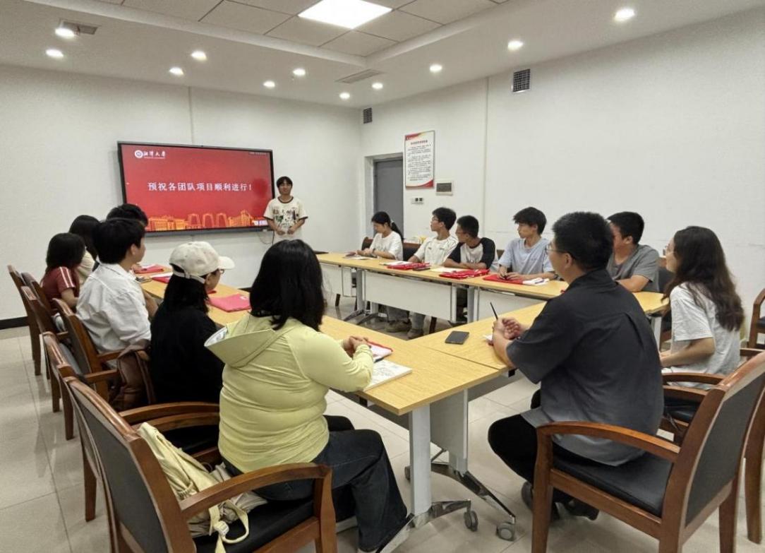 会议伊始,日韩欧美中文第八届团委、学生会社会实践部部长赵湘媛全面细致地梳理了活动各类注意事项,为各团队负责人提供了清晰指导。副部长滕志坤着重就新闻宣传工作作出部署,助力各团队打造高质量宣传成果;同时深入开展安全教育,要求各团队负责人将安全意识贯穿活动始终,筑牢思想防线。随后,2024年度暑期“三下乡”优秀团队代表李景彬结合自身团队经验,从前期活动筹备到后期成果宣传提出诸多建设性意见,为今年活动顺利开展提供了许多有益借鉴。最后,苗杰老师再次对活动安全问题进行强调,并希望大家坚持创新性原则,将课堂所学与社会实际相结合,特色化开展活动,把项目做得更好。