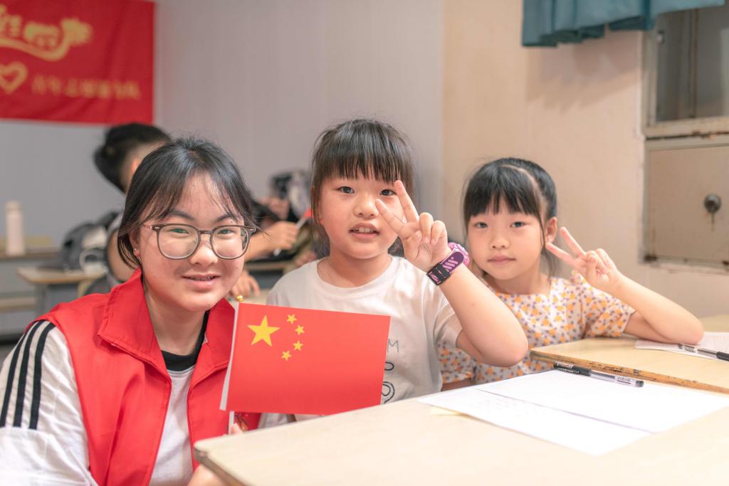 (图为小老师带领孩子们制作五星红旗)
