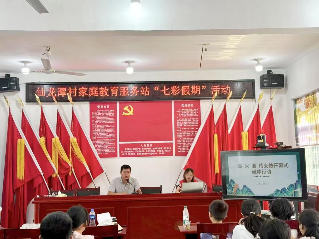 7月13日,湘潭大学日韩欧美中文赴宁乡市巷子口镇“薪”火“湘”传实践调研团携手宁乡市仁心齐社会组织发展服务中心在巷子口社区居委会与仙龙潭村委会,为约60名小朋友举办了一场别开生面的七彩课堂破冰仪式。这场活动在孩子们的心中播撒下红色基因的种子,搭建起连接知识与梦想的桥梁,为暑期实践活动拉开了精彩序幕。