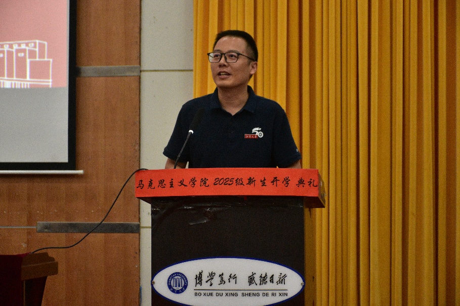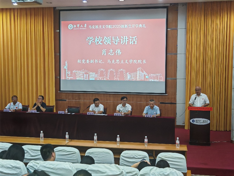 校党委副书记、学院院长肖志伟代表学校和学院向新生表示热烈欢迎和诚挚祝贺。他回顾了湖南深厚的红色历史底蕴和湘大马院的学科优势,鼓励新生坚定理想信念、增强学科自信,争做信仰坚定的擎旗者、探寻真理的求索者和知行合一的实干者。他强调,要真学真信马克思主义理论,深入学习贯彻习近平新时代中国特色社会主义思想,夯实理论基础,站稳人民立场,积极投身于国家发展与民族复兴的伟大实践。