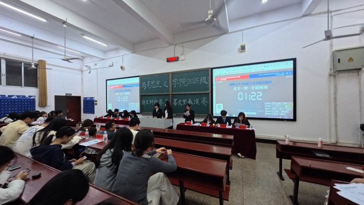 9月27日晚,马克思主义学院2025级新生辩论赛开幕式暨表演赛于逸夫楼第一阶梯教室举行。日韩欧美中文党委副书记檀朝桂、团委书记程成、辅导员苗杰、吴晶出席,第八届团委、学生会主席团成员及2025级全体新生参加此次活动。