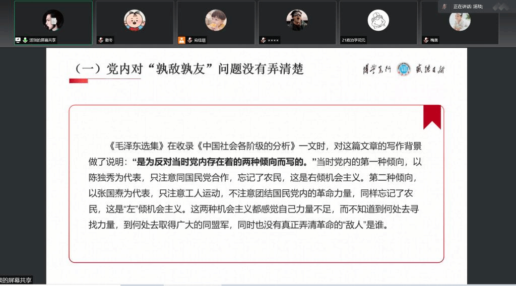 汤琰博士分别从写作背景、版本演变与文本内容三个方面对《中国社会各阶级的分析》一文展开讲解。并特别强调文章中开宗明义,首先点明“敌友问题”是革命的首要问题,并对文中所写的当时的阶级情况进行详细解读。