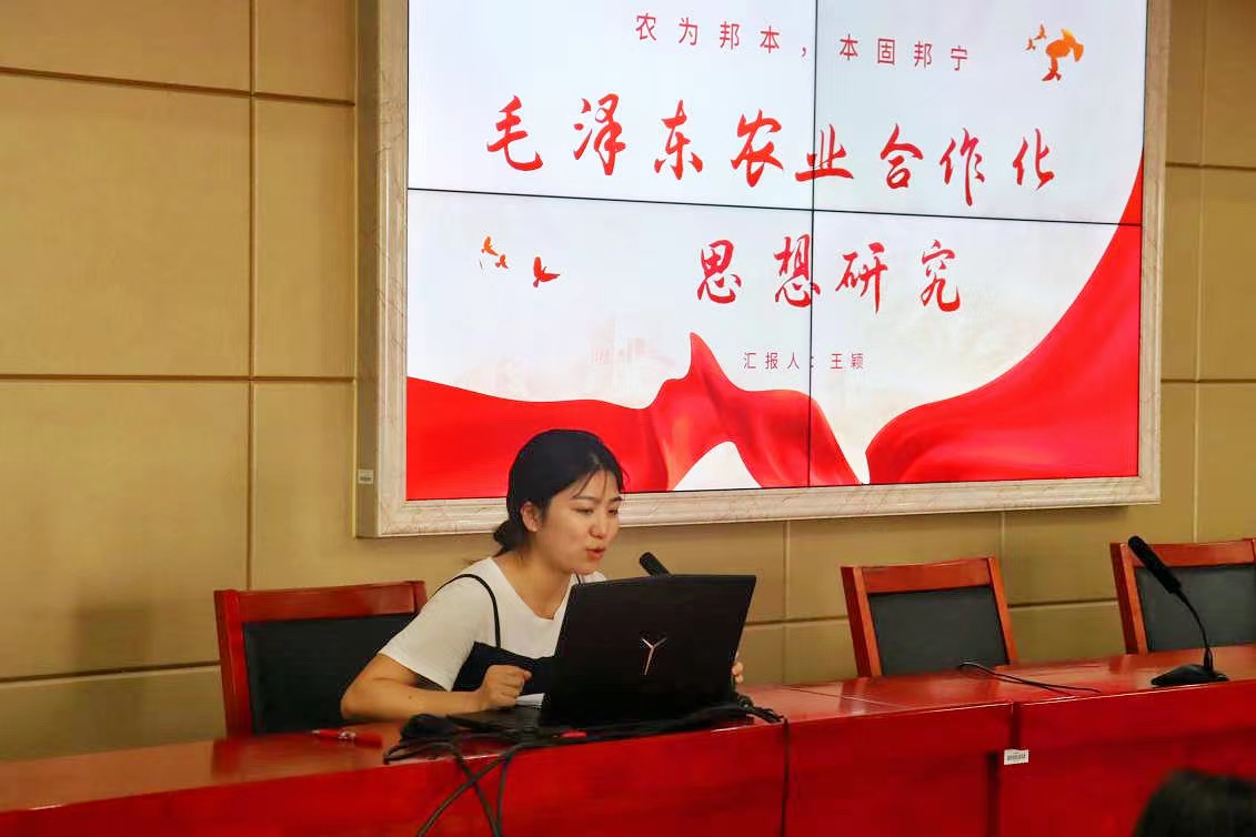 王颖以《毛泽东农业合作化思想研究》为题,分享了关于毛泽东农业合作化的研究背景、理论渊源、实践依据、主要内容以及研究展望。她认为,毛泽东农业合作化思想对于当前立足党的百年历史新起点,在尊重农业生产力发展客观规律的基础上结合我国当今农村的实际情况,实事求是协调农业发展各方面的关系,从而真正建成社会主义新农村具有重要意义。