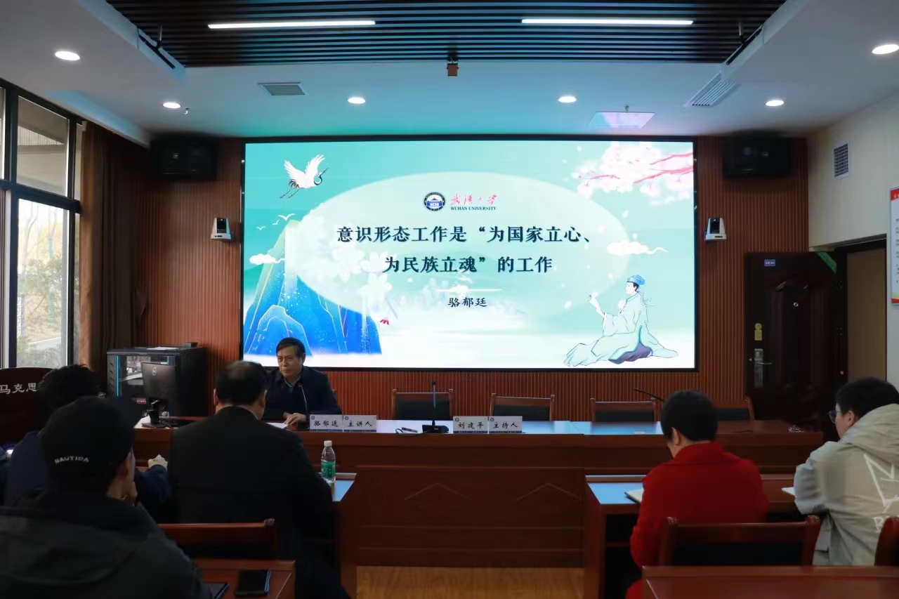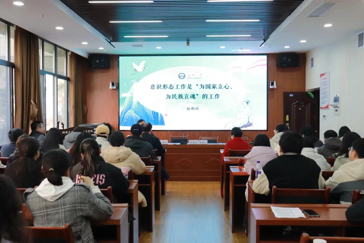1月6日下午,武汉大学思想政治教育研究院院长,国家“双一流”学科武汉大学马克思主义理论一级学科带头人,国家重点培育学科武汉大学思想政治教育学科负责人,国务院学科评议组召集人,国务院政府特殊津贴专家,国家社科基金学科评审组专家,中央“马工程”首席专家骆郁廷教授应邀作客“领航讲堂”,作了题为“意识形态工作是‘为国家立心,为民族立魂’的工作”的专题讲座。本次讲座由湘潭大学党委委员、副校长刘建平教授主持,学院九十余名师生聆听本场讲座。