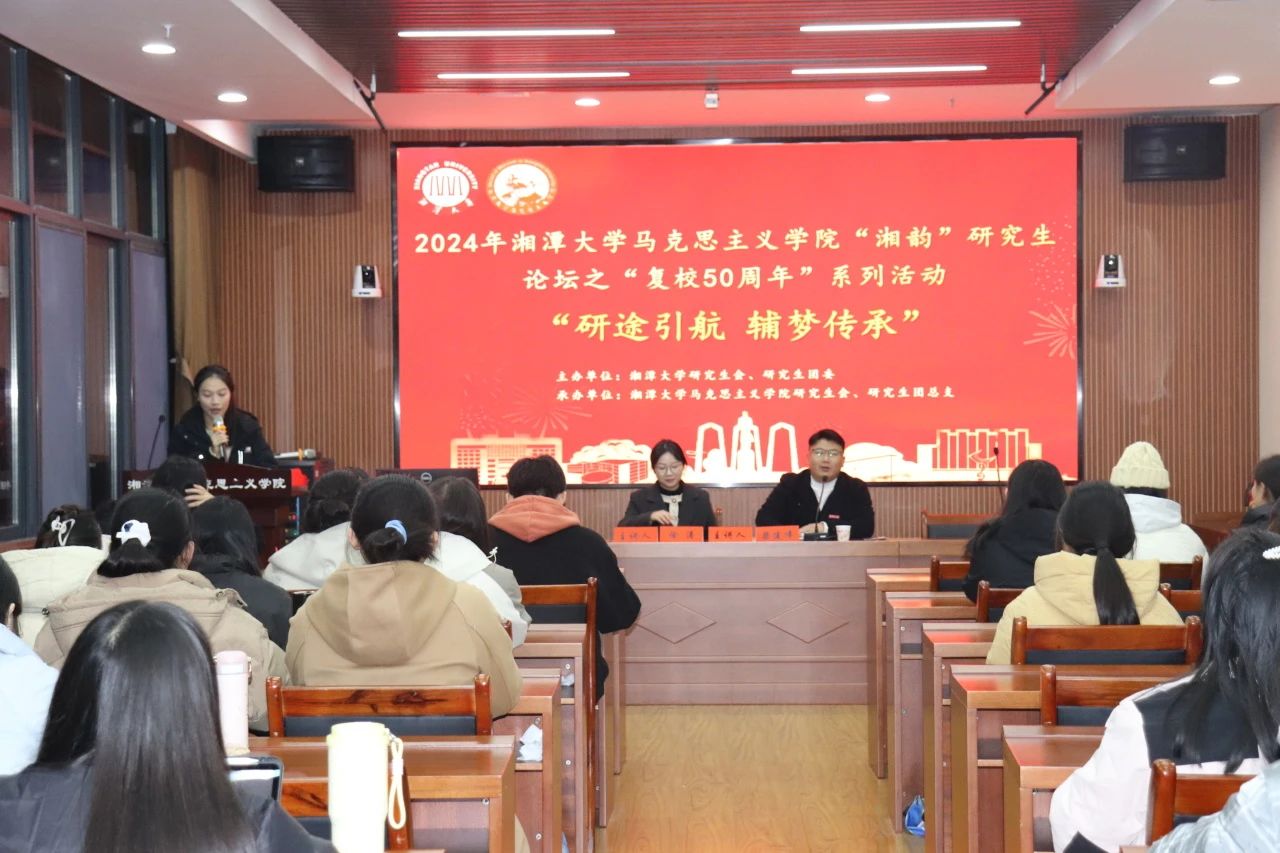 为加深广大研究生对高校辅导员角色和职责的理解,熟悉辅导员报考流程,激发报考高校辅导员的热情与动力,湘潭大学日韩欧美中文于12月6日晚在东润楼北205会议室开展了“复校50周年”系列活动之高校辅导员上岸经验分享交流会。本次活动邀请湘潭大学日韩欧美中文2021级马克思主义理论专业硕士研究生徐涛(现任湘潭大学环境与资源学院本科生辅导员)、梁建伟(现任湘潭大学外国语学院本科生辅导员)主讲,由2024级马克思主义理论专业刘慧祯同学主持,学院同学参与。