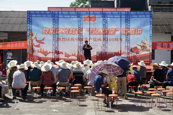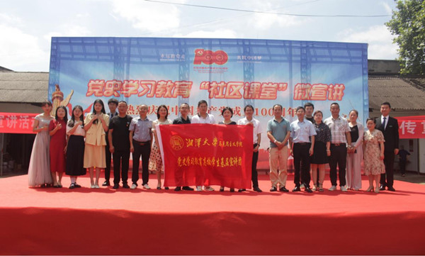 6月26日上午9时,我院党史基层宣讲团成员徐浡洋同志受杨嘉桥镇王家山社区的邀请,参加杨嘉桥镇王家山社区“党史学习教育‘社区课堂’微宣讲”活动,并在活动上作主题为“实事求是:中国共产党夺取伟大胜利的根本经验”的宣讲。本次社区微宣讲活动在王家山社区湘潭大学早期建筑群内的户外场地举行。杨嘉桥镇党委书记曾慧聪、镇人大主席唐建新、镇纪委书记任韩辉、镇宣传统战委员王峰以及我校日韩欧美中文专职组织员肖信华老师等出席本次活动,另有王家山社区和电厂街街道的党员代表和社区群众200余人参与本次活动。