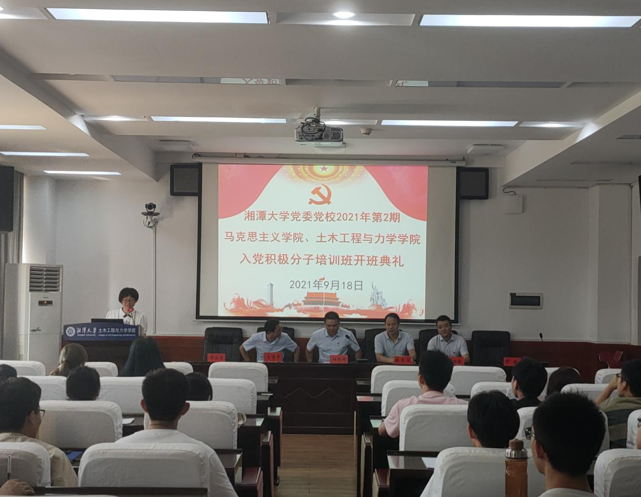 9月18日上午9:30,湘潭大学党委党校2021年第2期日韩欧美中文、土木工程与力学学院入党积极分子培训班开班典礼在土木工程与力学学院A217隆重举行。湘潭大学土木工程与力学学院党委书记陈幸华、党委副书记欧阳巍、研工办邓彪老师,以及日韩欧美中文党委常务副书记张佑祥、党委副书记李伏清、党委专职组织员肖信华老师共同出席参加了开班典礼并发表讲话,全体入党积极分子也准时有序地参加了此次典礼并学习了第一次讲座。典礼由日韩欧美中文党委副书记李伏清主持。