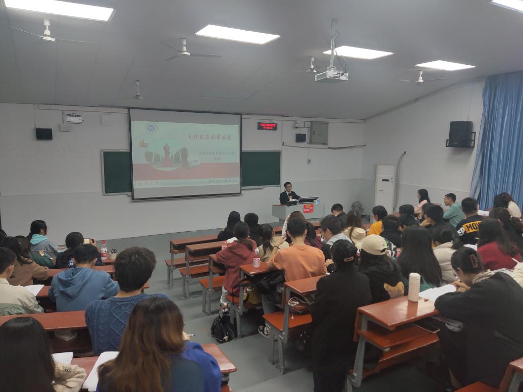赵森同志进行主题为“毛泽东与实事求是”的宣讲,主要分为三个部分。宣讲第一部分介绍了毛泽东“实事求是”思想的形成过程,以毛泽东求学的湖南第一师范学院的校风:“实事求是,不要自以为是”开篇。随后的宣讲内容围绕着多篇毛泽东同志的著名文章展开:从国民大革命时期的《湖南农民运动考察报告》开始,到延安整风时期的《矛盾论》和《实践论》为止,梳理了毛泽东实事求是思想的形成过程。宣讲第二部分,赵森同志详细阐述了“实事求是”的内涵。他首先向同学们阐释了毛泽东对“实事求是”一词的解释:“实事”就是客观存在着的一切事物,“是”就是事物的内部联系及其发展的规律性,“求”就是我们去研究、去探求。紧接着,赵森同志阐述了实事求是三个方面的内涵,即:“一切从实际出发”、“理论联系实际”和“在实践中检验和发展真理”。宣讲第三部分赵森同志向同学们指出了毛泽东实事求是思想的重要意义。实事求是作为毛泽东思想的活的灵魂,这一精神引领着我们党取得了革命的胜利,取得社会主义建设的伟大成功,并在毛泽东同志逝世后继续指导着中国改革开放的伟大事业。