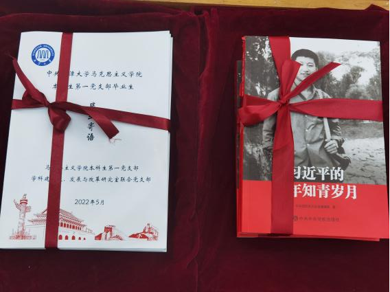 集体宣誓后,孙丽玉代表学院29名本科毕业生党员发了言。刘思思代表学科建设处、发展与改革研究室联合党支部,向我院本科毕业生党员每人赠送一本《习近平的七年知青岁月》,毕业生党员则回赠了由全体毕业生用诗词、书画、寄语等合集而成的暖心礼物。