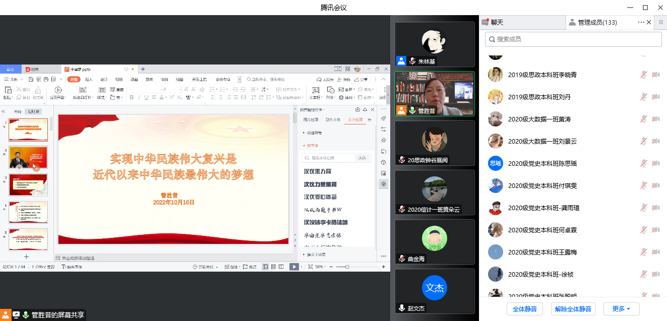 10月15日下午14:30至17:30,湘潭大学党委党校2022年第2期日韩欧美中文分党校、数学与计算科学学院分党校和艺术学院发展对象培训班在线上举行了第二、三次讲座学习,讲座有幸请到了艺术学院院党委副书记管胜昔老师和数学与计算科学学院院党委书记张普老师分别为学员授课。全体发展对象热情高涨、聆听学习了本次讲座。