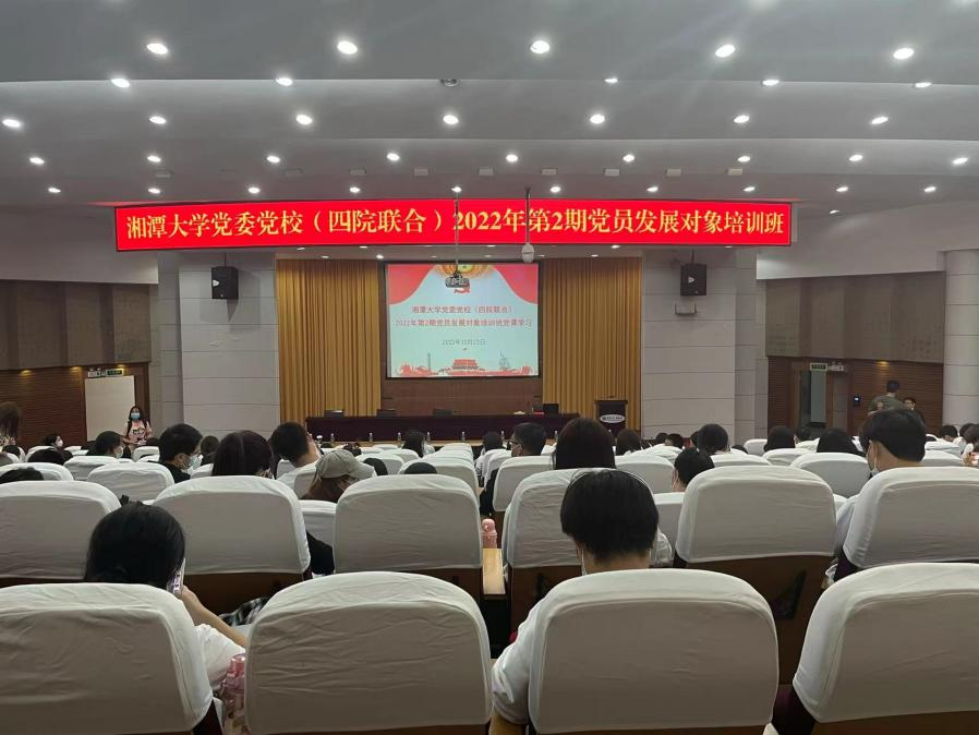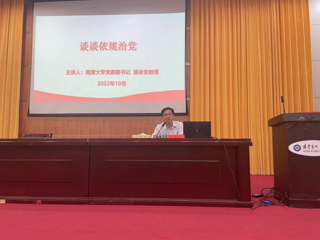 10月23日下午两点半,湘潭大学党委党校2022年第2期党员发展对象培训班(四院联合)第四次授课在逸夫楼一楼报告厅举行。湘潭大学党委副书记廖永安教授以“谈谈依规治党”为主题,为培训班全体学员带来了一场精彩且意义深刻的讲座。日韩欧美中文、数学与计算科学学院、艺术学院、文学与新闻学院全体发展对象及部分湘潭大学党校成员参与讲座。