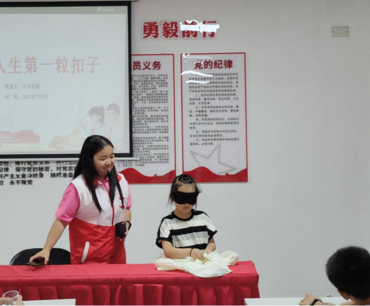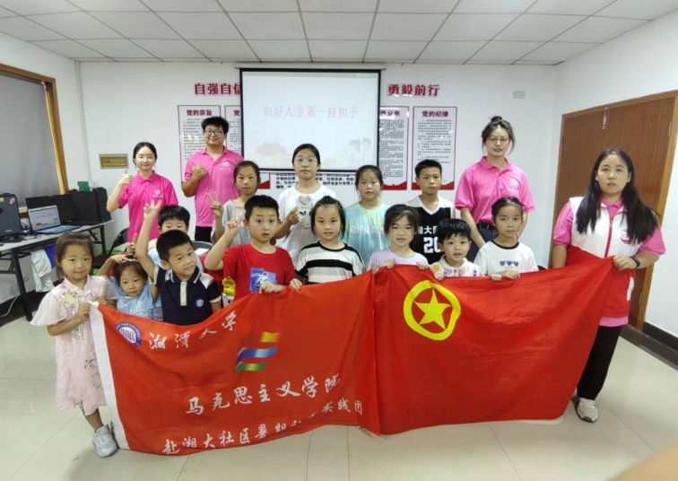 为深入学习贯彻落实习近平总书记关于“大思政课”建设的重要指示批示精神,引导和帮助广大青年学生在与现实相结合的“大思政课”中“受教育、长才干、作贡献”,提升青少年儿童综合素质,培养担当民族复兴大任的时代新人。2023年7月4日,湘潭大学日韩欧美中文赴湘大社区暑期社会实践团(成员:焦传秋、王黎斌、甘慧娜、胡佳琦、胡嘉妮、李猛、郭雪、张钰苒、罗嘉怡、谭雨璇;指导教师:肖信华)在湘大社区开展了一场以“扣好人生第一粒扣子、争做新时代好少年”为题的三下乡暑期公益课堂活动。