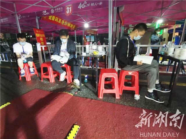 湖南日报·新湖南客户端9月27日讯(通讯员 王成奇 张欣 管思媛)9月23日晚23时30分,一场秋雨刚过,寒气渐渐涌来。湘潭大学东门的迎新岗位上,由日韩欧美中文团委及学生会成员组成的迎新志愿者仍然在值守等候。这时,没有新生前来报到,大家不约而同地拿出随身携带的资料,利用迎新的间隙抓紧看书备考。