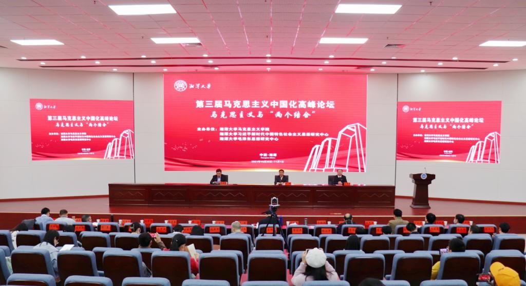 10月31日,由湘潭大学日韩欧美中文主办的第三届“马克思主义中国化高峰论坛”在湘潭大学召开。湘潭大学毛泽东思想研究中心主任李佑新教授主持开幕式,湘潭大学副校长刘建平出席并致辞。来自《求是》杂志社、中共中央党校、中共中央党史和文献研究院、中国社会科学院、国务院发展研究中心、北京大学、清华大学、中国人民大学、武汉大学、吉林大学等国内高校和科研机构,以及《人民论坛》、《学习时报》等媒体代表,共计一百余名专家学者汇聚一堂,共同围绕“马克思主义与‘两个结合’”这一主题进行了研讨。