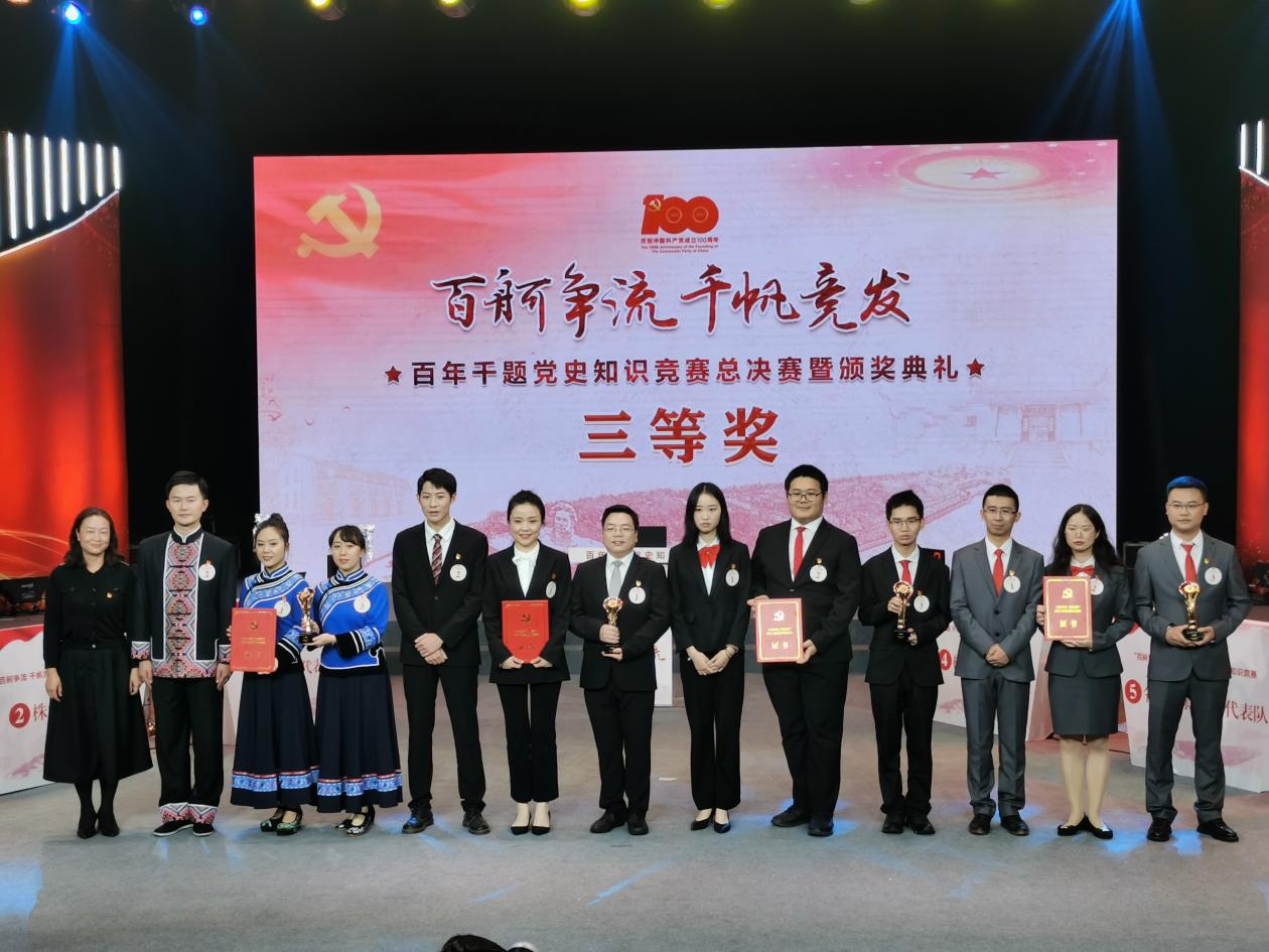 比赛以学习党的百年奋斗光辉历史、习近平总书记关于党的历史的重要论述、习近平总书记七一重要讲话精神为主要内容开展答题比赛。总决赛中,我代表队队员精神焕发、斗志昂扬、自信满满,丰富的知识储备和出色的现场表现,赢得了观众的阵阵掌声。经过两轮比拼,我院学生组成的省委教育工委代表队斩获三等奖。