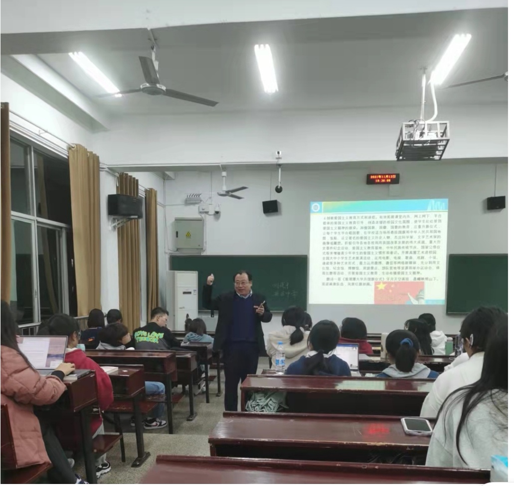 2021年11月12日晚上7点,湘潭大学副校长刘建平教授走进《思想道德与法治》课堂,以“弘扬湘大精神,争做时代新人”为主题,为2021级法学卓越班、公共管理类韶峰班、经济学类韶峰班的同学们带来了一堂生动有趣的思政课。