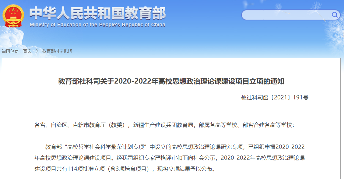 教育部设立高校思想政治理论课建设项目,旨在推动新发展阶段高校思想政治理论课高质量发展,充分发挥落实立德树人根本任务的关键课程作用,努力培养德智体美劳全面发展的社会主义建设者和接班人。本次评审是由教育部组织评审的首批全国高校思政课名师工作室,自2020年11月启动,经各高校申报,各省限额推荐,教育部组织专家严格评审,评审出全国高校思政课名师工作室69家。
