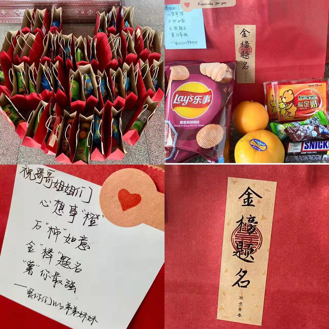 此外,考研学子收到了我院精心准备的礼物,礼包里有棒棒糖、橙子、脆柿、暖宝宝等,寓意各位学子能够心想事“橙”、万“柿”如意、金“棒”题名。“收到学院老师和学弟学妹的祝福,我们内心很温暖。考研路上并不孤单,马院永远是我们最坚强的后盾。”收到礼物的考研学子很是感动地说到。