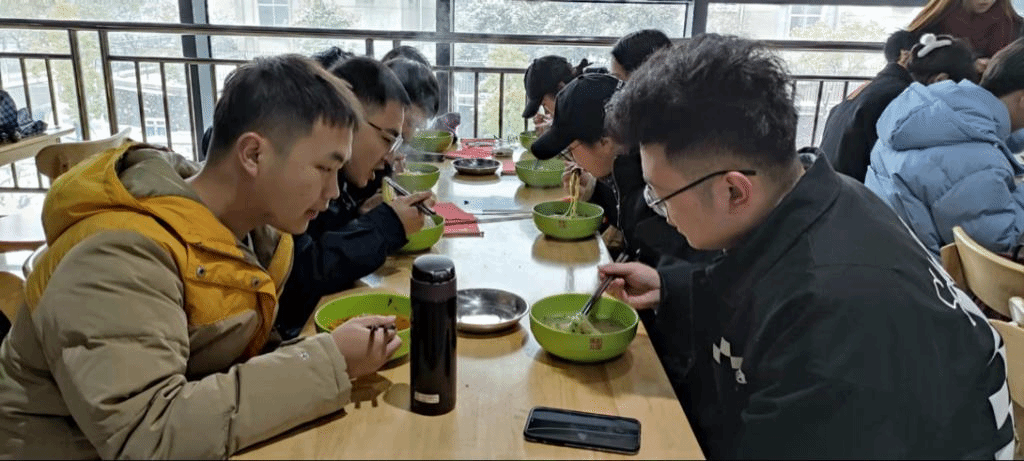 “风雨送春归,飞雪迎春到。”26日早,志愿者们伴着突如其来的大雪赶到服务点,妥善安排第一批师生食用“福寿面”的相关流程,包括背诵主席诗词、顺序签到、发放小红旗等,使身处伟人故里的同学们深刻感受红色精神,红色文化。十点半,日韩欧美中文李伏清、李雅兴、洪梅三位老师带领学生同唱东方红,共念主席恩,同学们挥舞小红旗积极回应。红歌嘹亮,思念如潮,红旗与旋律相和,在日韩欧美中文各支部和全校各院系师生的手中舞成一片红海。“……哪里有了共产党,呼儿嘿呀,哪里人民得解放……”饱含深情的歌声从口中迸出,回荡在在场每一位同志的耳边,现场气氛十分热烈。合唱结束后,同学们排着队,井然有序领取福寿面。伴着福寿面氤氲出的阵阵香气,怀着对毛主席的崇敬之情,抱着对美好生活的祝福与期盼,大家将面条吃进肚子,将初心理想牢牢刻在心间。