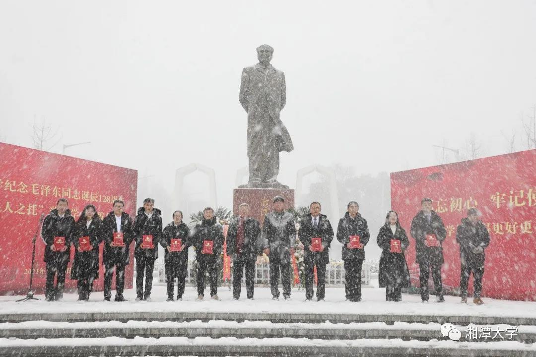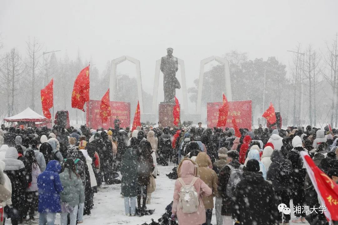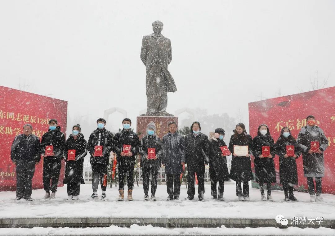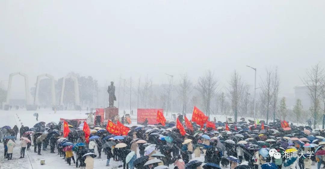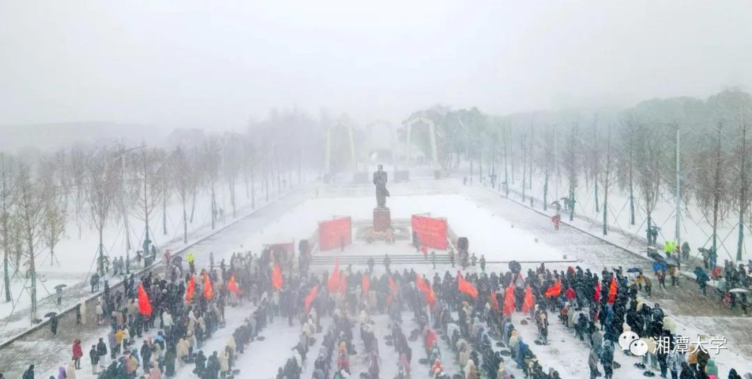12月26日上午,湘潭大学纪念毛泽东同志诞辰128周年暨“伟人之托”奖助学金颁发仪式在湘大南校门毛主席铜像广场举行。银装素裹,皓然一色,纷飞的雪花诉说着对毛泽东同志的敬仰之情。师生们合唱着《太阳最红毛主席最亲》《我和我的祖国》等歌曲,表达着对伟人的怀念和敬仰。在白雪中,湘大师生立誓,不忘初心、牢记使命,一定要把湘潭大学办得更好更有特色。