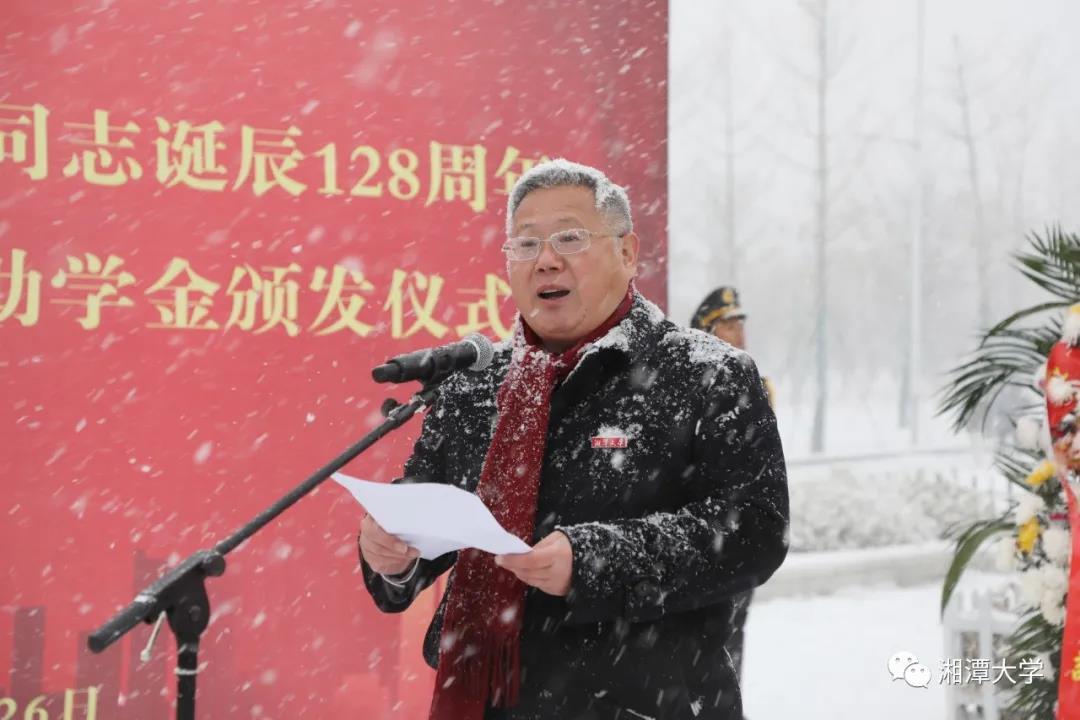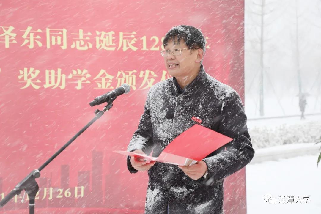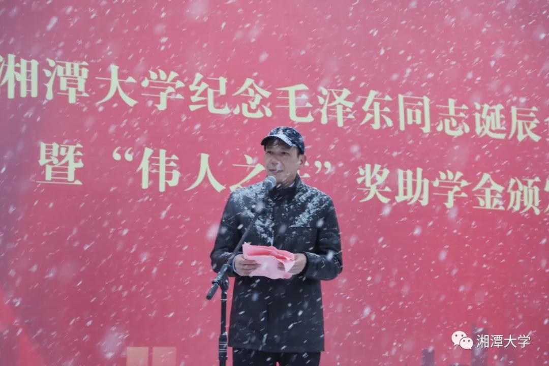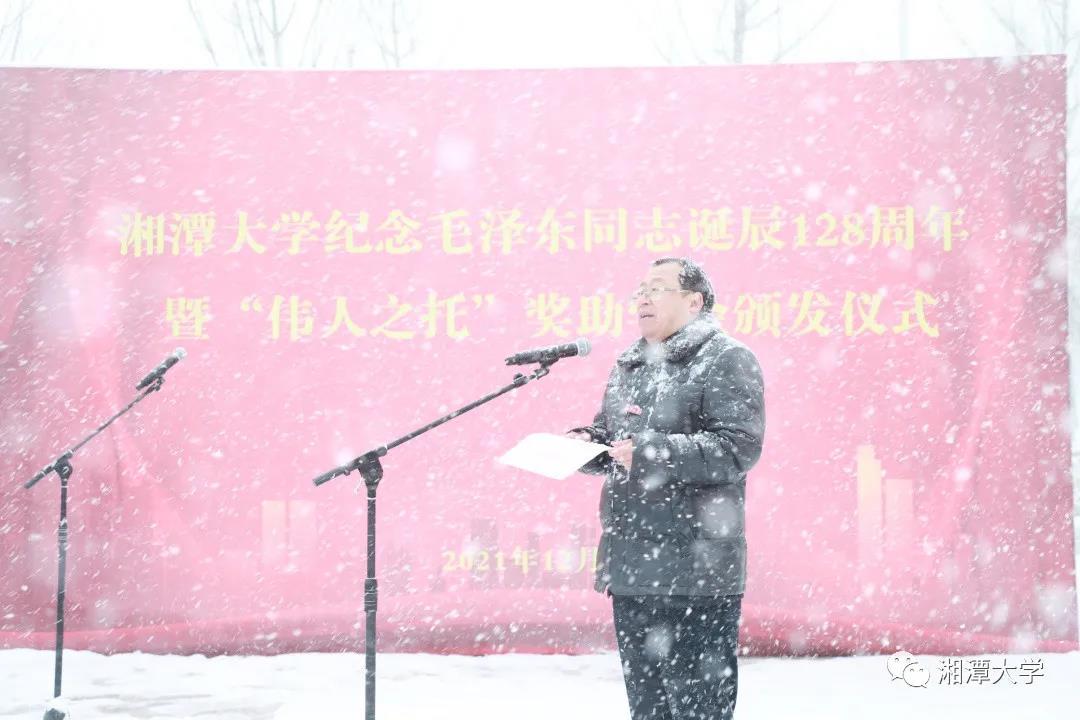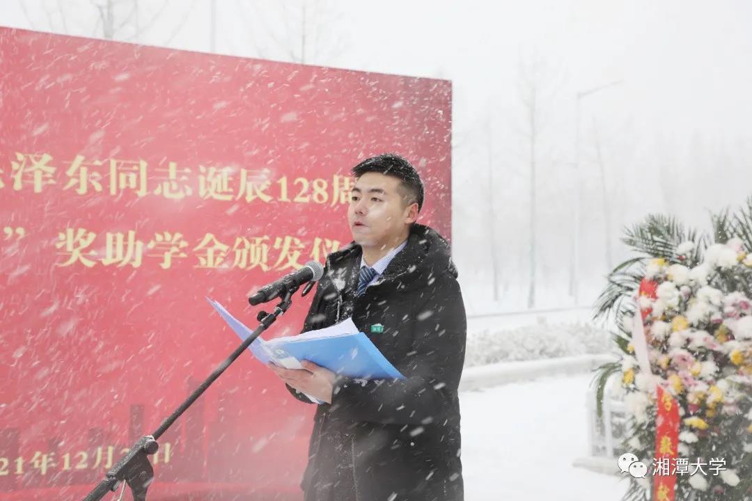 12月26日上午,湘潭大学纪念毛泽东同志诞辰128周年暨“伟人之托”奖助学金颁发仪式在湘大南校门毛主席铜像广场举行。银装素裹,皓然一色,纷飞的雪花诉说着对毛泽东同志的敬仰之情。师生们合唱着《太阳最红毛主席最亲》《我和我的祖国》等歌曲,表达着对伟人的怀念和敬仰。在白雪中,湘大师生立誓,不忘初心、牢记使命,一定要把湘潭大学办得更好更有特色。