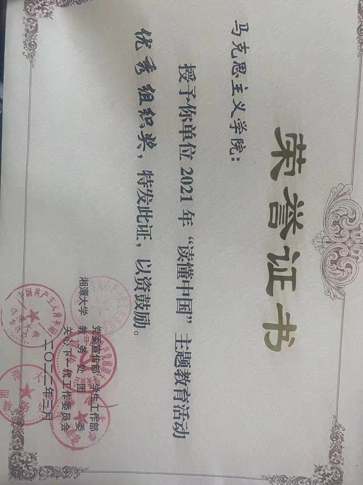 (通讯员 程 成 刘静远)315日下午,湘潭大学2021年“读懂中国”主题教育活动总结暨2022年动员大会如期举行。我院斩获“优秀组织奖”等多个奖项。