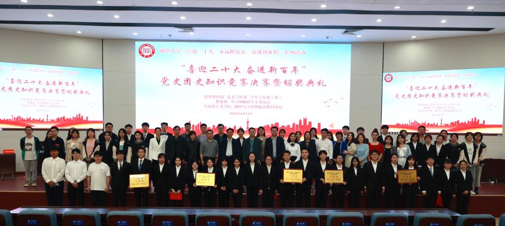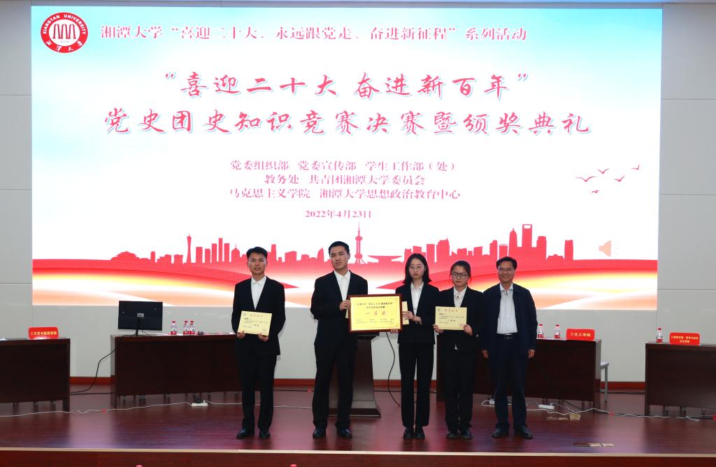 (通讯员 程成 刘青山 张若溪)4月23日晚,湘潭大学“喜迎二十大 奋进新百年”党史团史知识竞赛决赛暨颁奖典礼在研究生院学术报告厅举行。此次竞赛吸引了近一万名学子参加初赛,根据初赛的平均成绩和学院参与率的综合测算,8个学院代表队进入决赛,为观众带来了一场精彩的知识盛宴。湘潭大学党委副书记廖永安出席本次比赛。