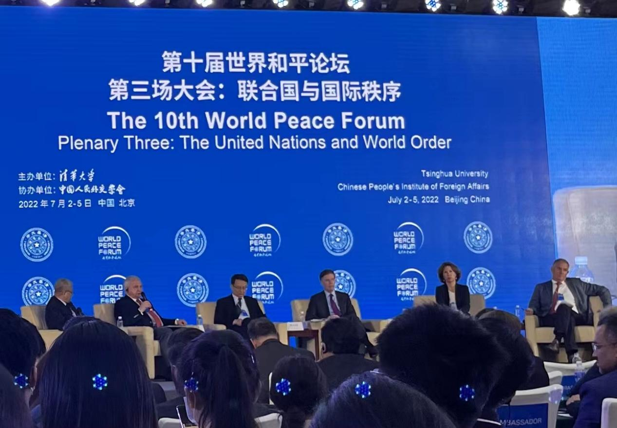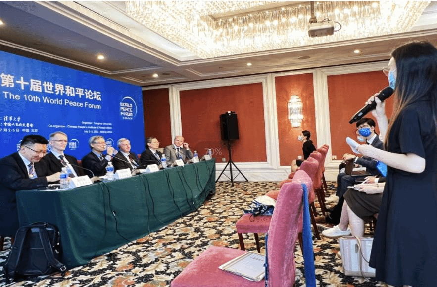 第十届世界和平论坛的主题为“维护国际战略稳定:共同、综合、合作”。7月4日,第十届世界和平论坛第二日日程在北京辽宁大厦举行,包括2场大会与10场小组讨论。4日上午世界和平论坛秘书长阎学通主持题为“联合国与国际秩序”的讨论大会,联合国五个常任理事国的四国驻华大使同第十三届全国政协常务委员贾庆国针对乌克兰危机及其带来的能源和粮食危机展开讨论,并就联合国秩序与作用的发展以及未来国际秩序的走向提出思考与展望。4日下午泰国前副总理素拉杰、上海合作组织前秘书长阿利莫夫以及伊朗前外交部长卡迈勒·哈拉齐分别从东盟、中亚、波斯湾视角,在线上进行了题为“区域组织与地区秩序”的讨论。我院学习小组成员积极参会,认真聆听讨论,并就感兴趣的领域踊跃发言。陈佩杏、龙诗桂就新加坡在东盟中发挥的作用、欧洲国家在俄乌冲突中的责任等问题向发言嘉宾提问,与各国驻华使节、智库负责人面对面交流互动,收获知识与启发。