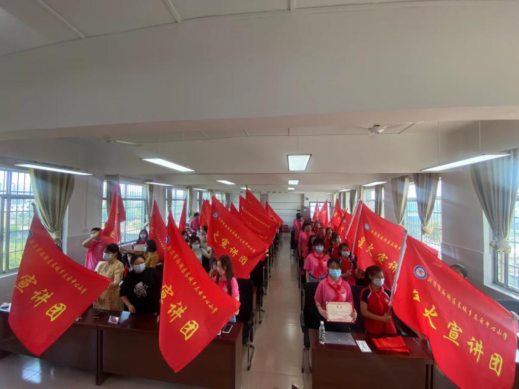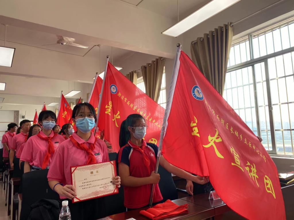随后,湘潭大学日韩欧美中文星火宣讲团23名学生作为星火思政辅导员与立云中心小学学生宣讲团结对,她们将象征着“星火”精神的旗帜送到小小宣讲员的手中,今后他们将一对一协助各班开展思政教育活动。