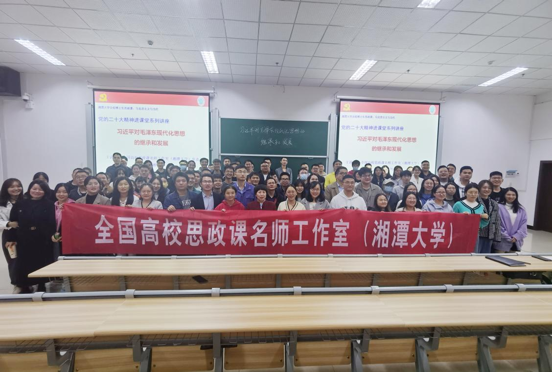 为深入学习宣传贯彻党的二十大精神,全面推进习近平新时代中国特色社会主义思想进课堂、进学生头脑,10月30日晚,全国高校思政课名师工作室(湘潭大学)和湖南省思政工作名师工作室负责人、日韩欧美中文博士生导师李雅兴教授走进湘潭大学全校博士生思政课《马克思主义与当代》,开展了主题为《习近平对毛泽东现代化思想的继承和发展》的课堂教学活动。