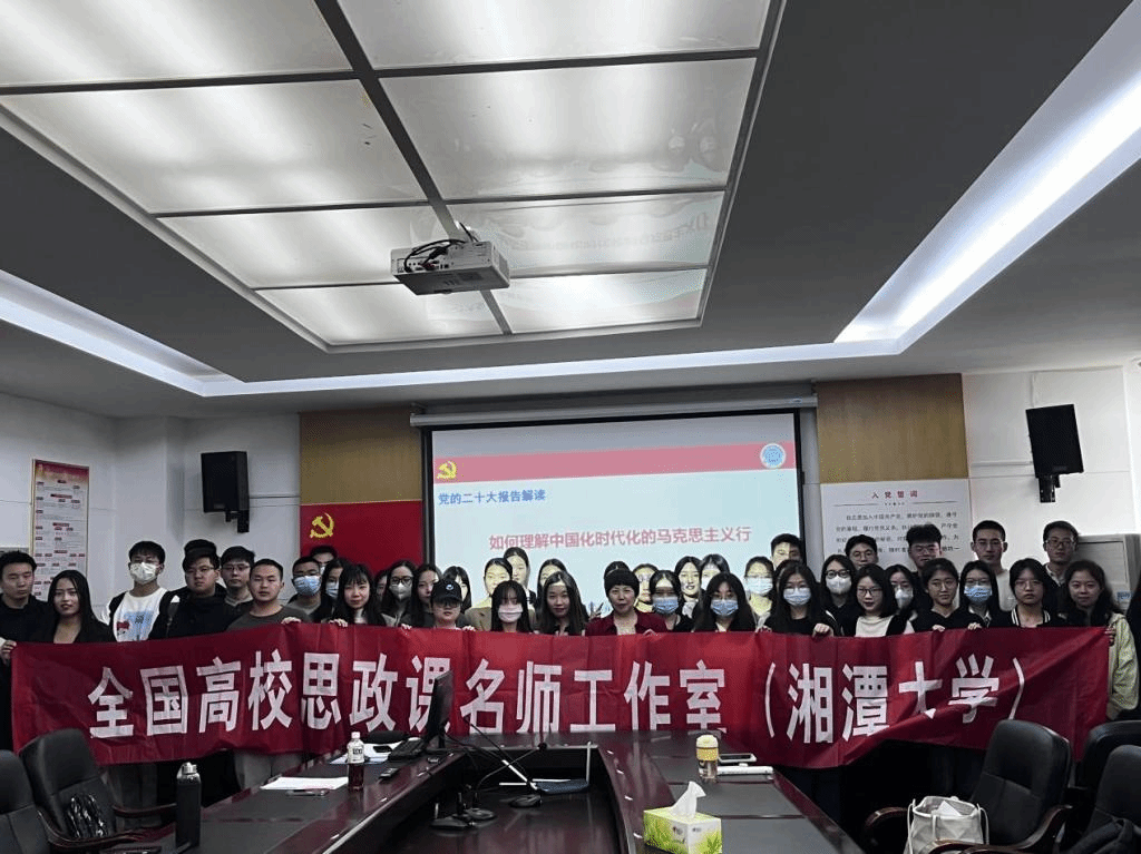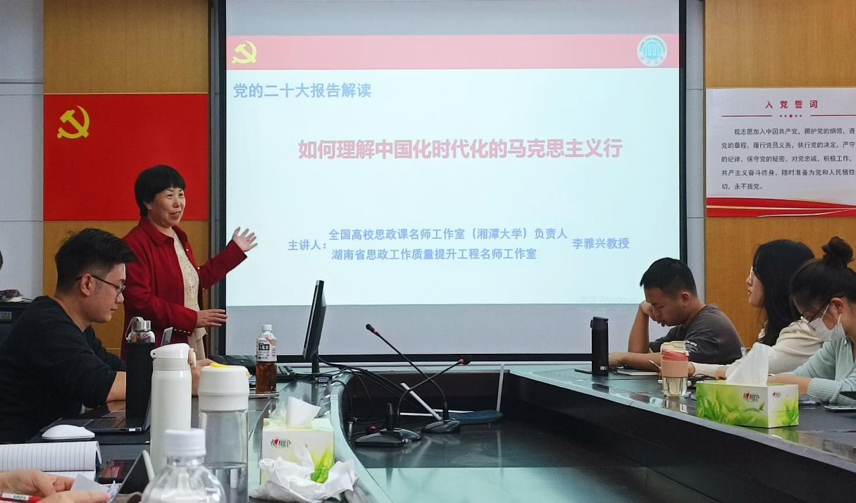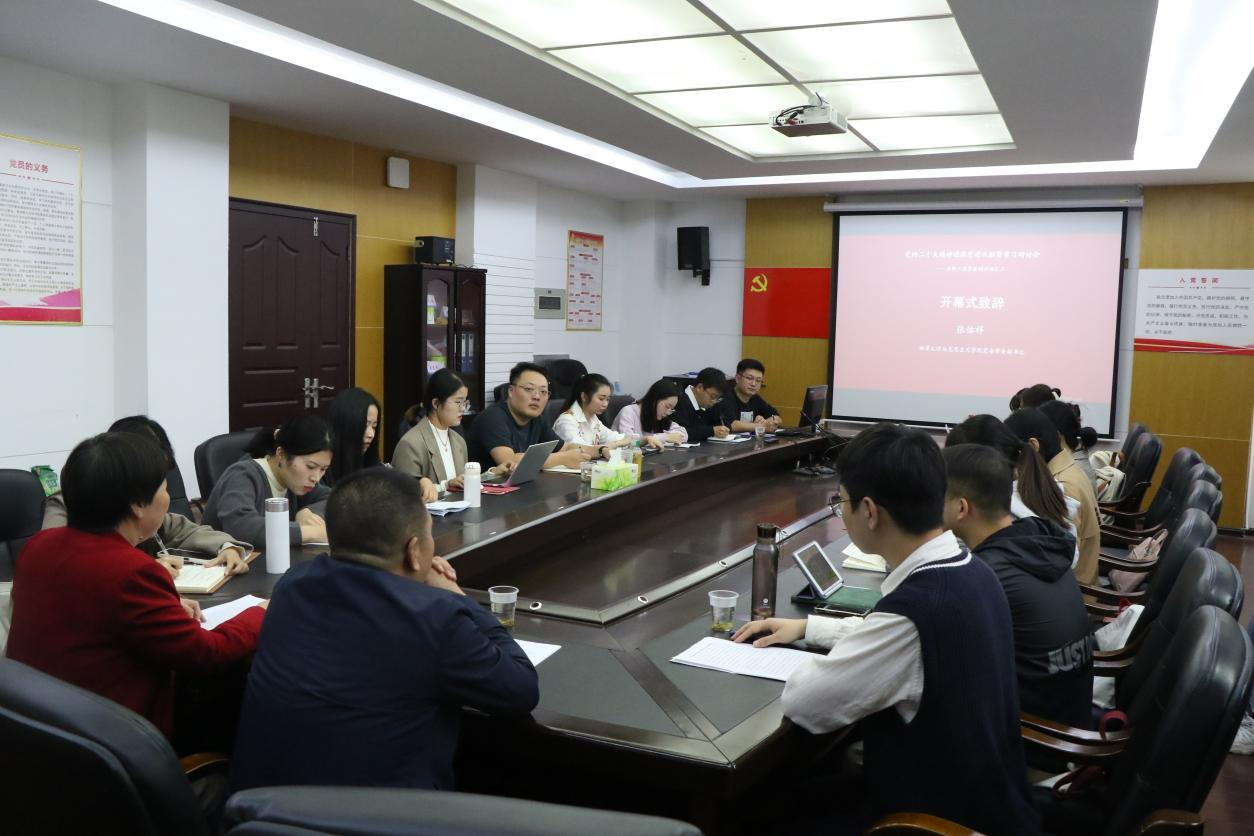 为深入学习宣传贯彻党的二十大精神,让党的创新理论入脑入心,11月3日下午,由湘潭大学日韩欧美中文主办、全国高校思政课名师工作室(湘潭大学)、湖南省思政工作质量提升工程李雅兴名师工作室承办的“党的二十大精神进课堂进头脑暨学习研讨会”在湘潭大学举行。研讨会分为两个阶段,第一阶段是2021级马克思主义中国化研究方向的46名硕士研究生参加,第二阶段是两个名师工作室的部分成员,包括马克思主义理论博士生、硕士生代表和特邀本科生代表参加。日韩欧美中文党委常务副书记张佑祥出席并致辞,两个名师工作室负责人李雅兴教授主持并作主旨报告。