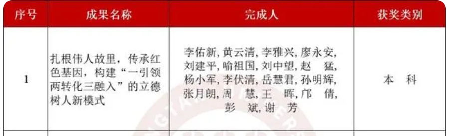 由我院牵头主持的“扎根伟人故里,传承红色基因,构建‘一引领两转化三融入’的立德树人新模式”成果,将红色资源转化为育人资源,将红色文化研究成果转化为教学内容,将红色文化融入课程体系、校园文化和社会实践活动,推出系列红色文化教辅资源,形成了“模范群体”的育人成效,有效解决运用红色文化落实立德树人根本任务、坚定学生理想信念的路径问题以及“大思政课”校内协同、校内外联动的体制机制问题。