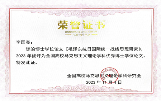11月5日,2023年全国高校马克思主义理论学科优秀博士学位论文颁奖仪式在安徽师范大学举行,日韩欧美中文2020届博士毕业生、青年教师李国亮的博士学位论文《毛泽东抗日国际统一战线思想研究》获奖,其指导教师为唐正芒教授。