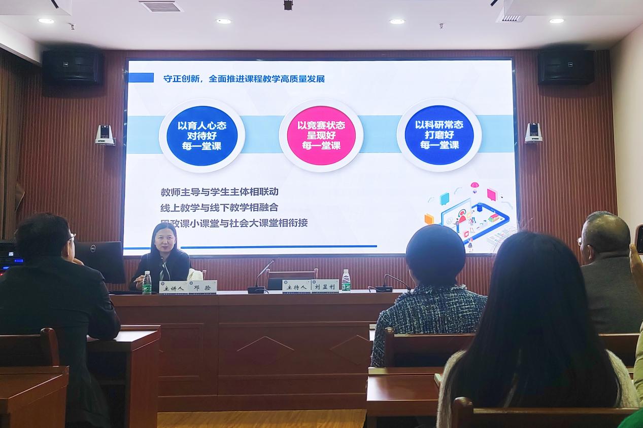 会上,邓验老师以高校思政课教学设计核心要素研究为主题,就“习近平新时代中国特色社会主义思想概论”课必须注意的问题,从学情分析、教学目标、教学内容、教学重难点及解决措施、教学方法、教学实施过程、教学资源及工具、板书设计、教学评价与反思九个方面作专题辅导。邓验老师以层层递进、详略得当的方式,讲述了“情景话语设问”“一案到底”“图文结合”等教学方法,指出教学活动秉持以学生为中心,坚持整体性、一体化思维,以育人心态对待好每一堂课;以竞赛状态呈现好每一堂课;以科研常态打磨好每一堂课的教学态度,坚持教师主导与学生主体相联动,线上教学与线下教学相融合,思政课小课堂与社会大课堂相衔接。