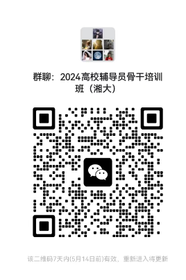 为方便组织和交流,请所有参训学员加入微信群“2024高校辅导员骨干培训班(湘大)”。(如微信群二维码失效,可报到时加入培训班微信群)